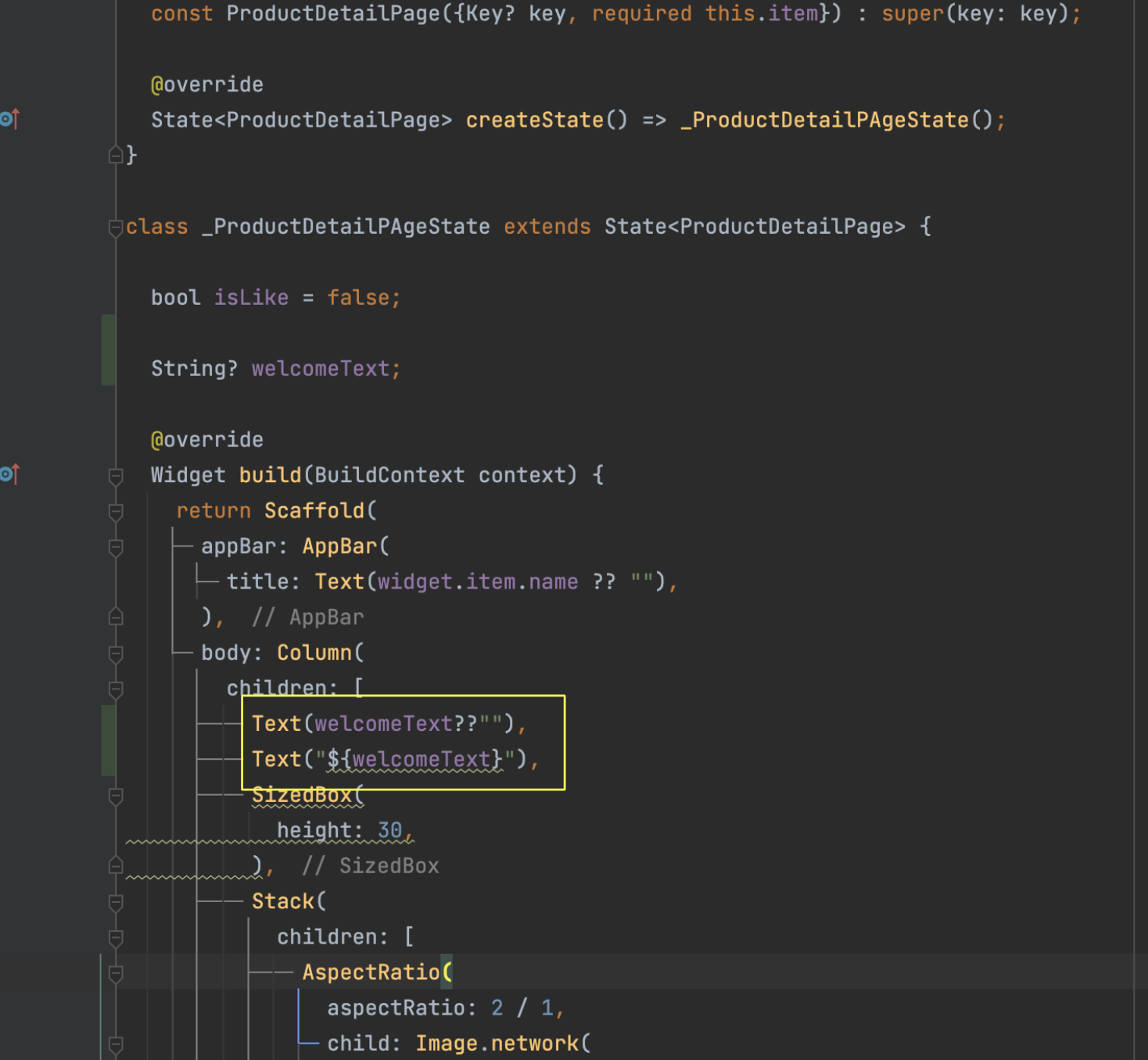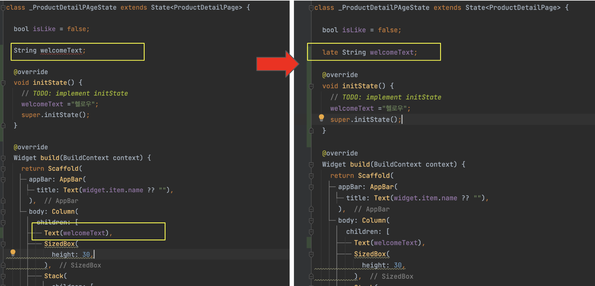 그리고 welcomeText가 사용되기전에 initState에서 welcomeText의 초기값을 주고있기때문에 정상적으로 작동됩니다.
