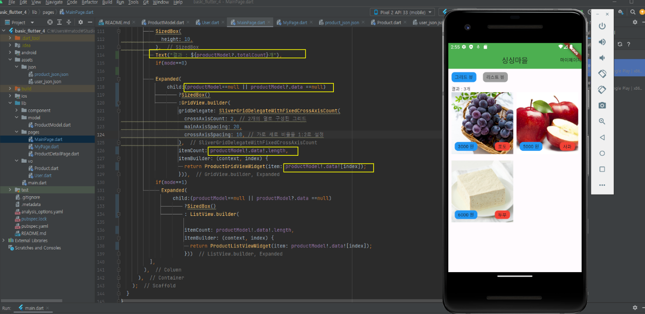 build 부분을 보면 Row위젯으로 리스트뷰,그리드뷰를 선택할수있게 버튼을 만들었습니다.