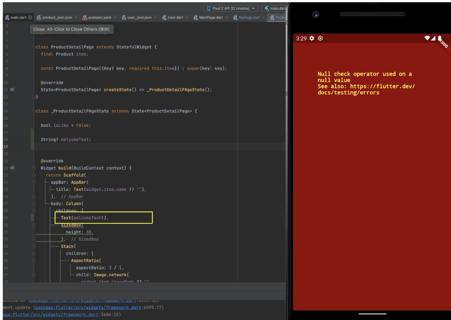 두개의 경우 모두 welcomeText가 null 이라면 Text("") 이런식으로 되는것과 쌤쌤이 됩니다. 이렇게 null 에대한 대비책을 만들어두면 에러가 사라지게 되고, 런타임중에도 이것 때문에 에러가 발생하지는 않게 됩니다.