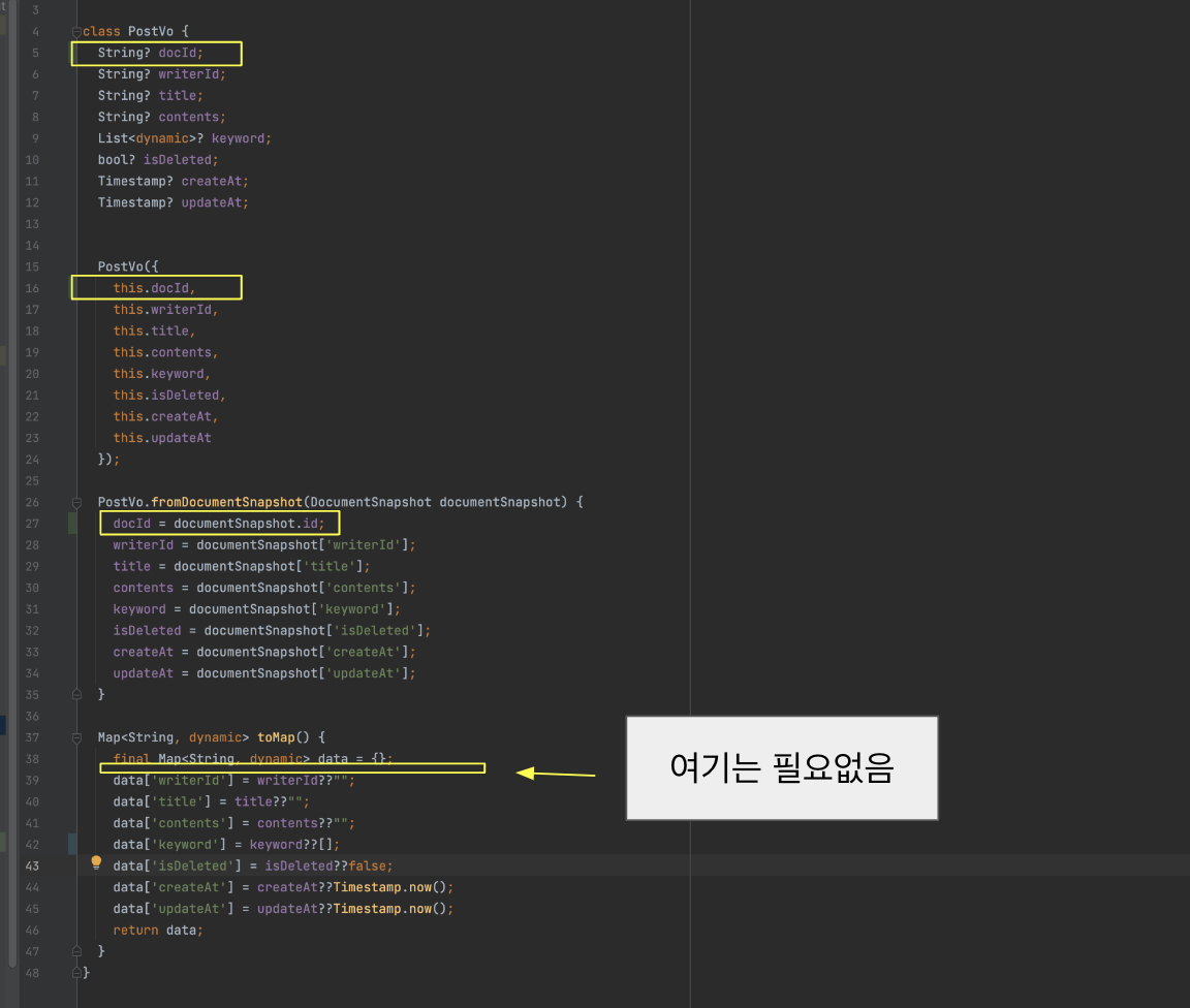 그런데 우리는 postVo에 문서 id 정보를 담지 않았습니다. 그래서 postDetailPage에 문서 id정보를 넘겨줄수가 없습니다.