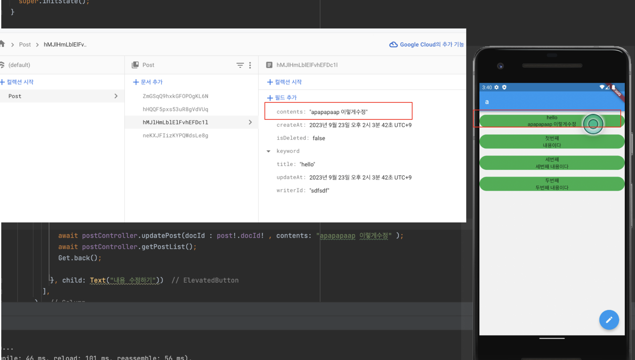 대충 내용수정하기 버튼을 누르면 해당 docId를 찾아서 내용을 "apapapap 이렇게수정" 이라는 문자열로 수정해보겠습니다.
