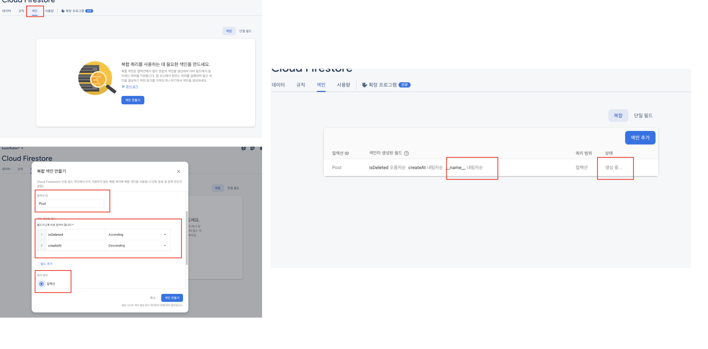 그랬더니 에러가 뜨면서 리스트에는 아무것도 안보이게 되는데요, 이 문제는 이 강의 맨 위쪽에 제시한 fireStore의 단점중에 하나로 다중조건일때는 index를 만들어 해결할수있다고 했었습니다.