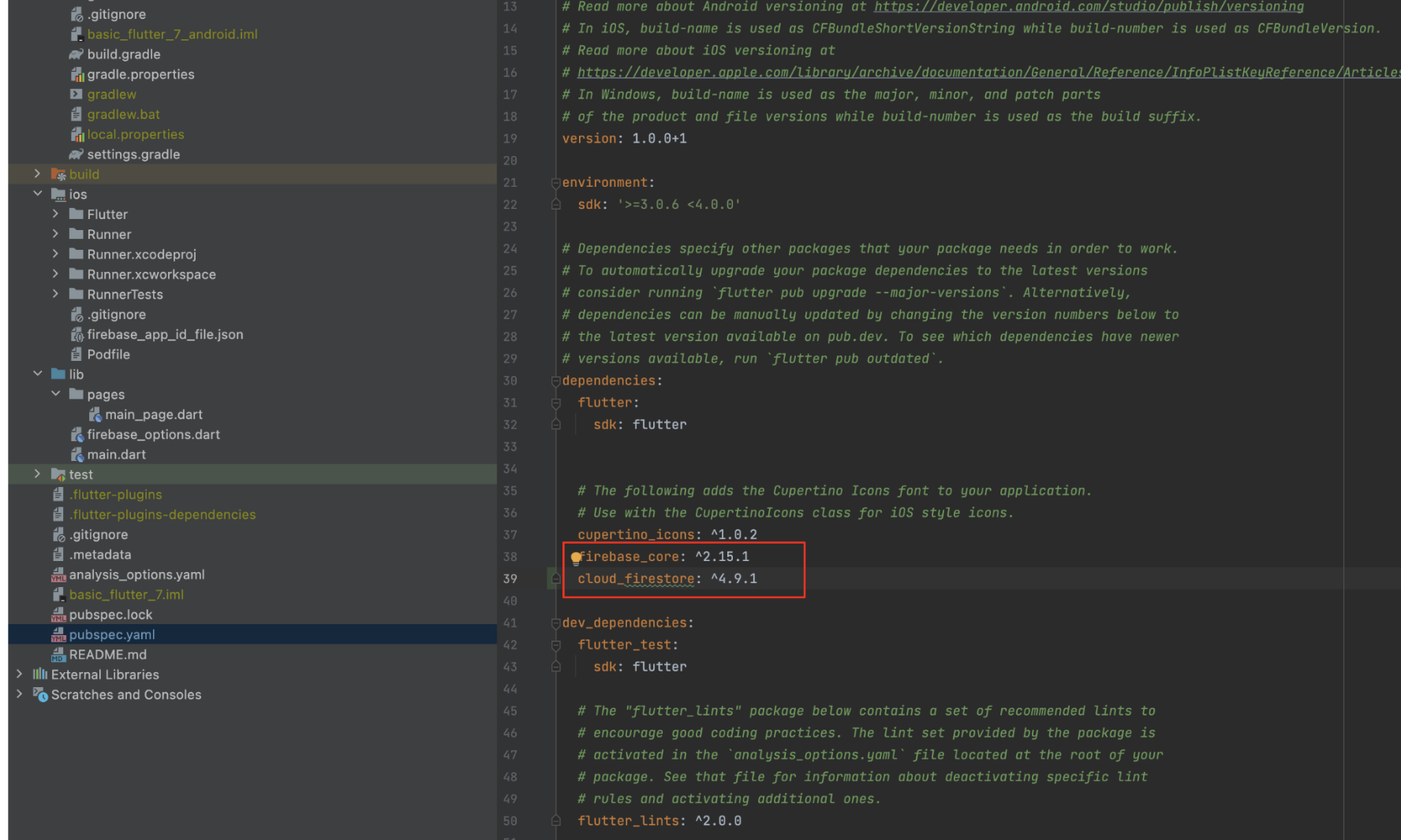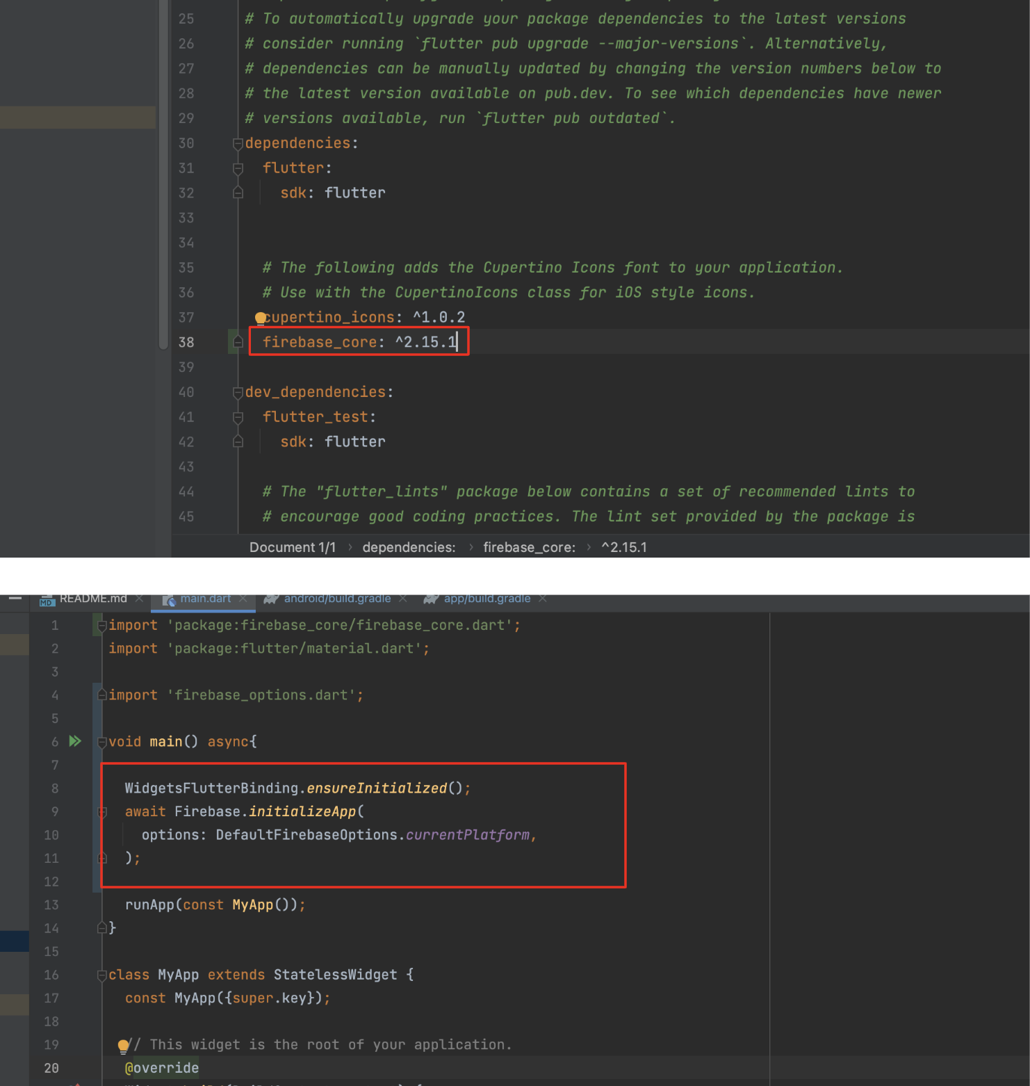 flutter 라이브러리 다운받는곳에 firebase_core를 쳐서 버전 확인한다음 pubspec.yaml에 라이브러리를 등록해주세요.