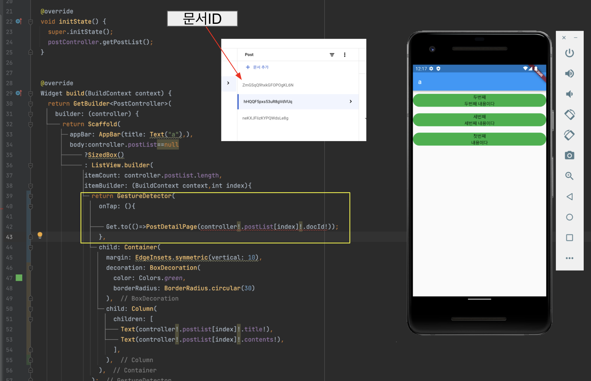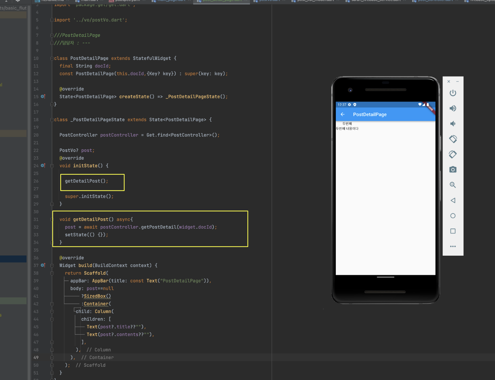 이렇게 포스팅 리스트중에 1개를 누르면 PostDetailPage로 가는데 매개변수로 문서의 id를 넘겨줘서, 그 id로 InitState에서 특정문서찾기 메소드를 발동시켜 특정 문서를 찾도록 할것입니다.