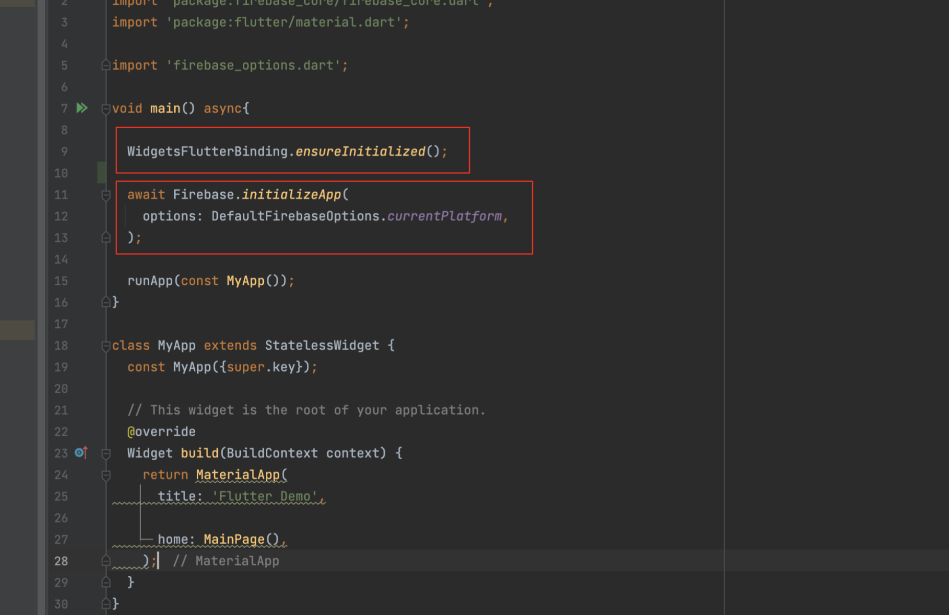 그리고 main 함수쪽에 와서 runApp메소드 전에 Firebase.initializeApp 을 해줘야합니다. WidgetFlutterBinding도 해줘야합니다. 위처럼 하면됩니다.