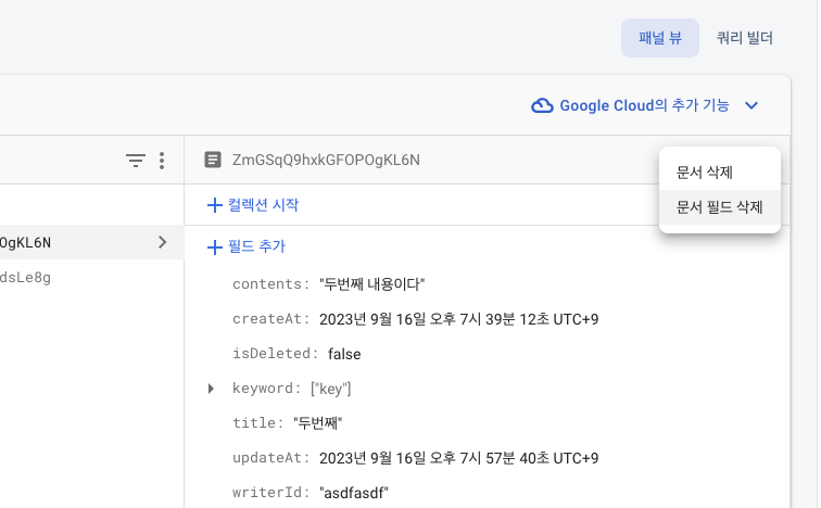 삭제버튼을 누르니, 해당 문서가 삭제된것이 보일겁니다.