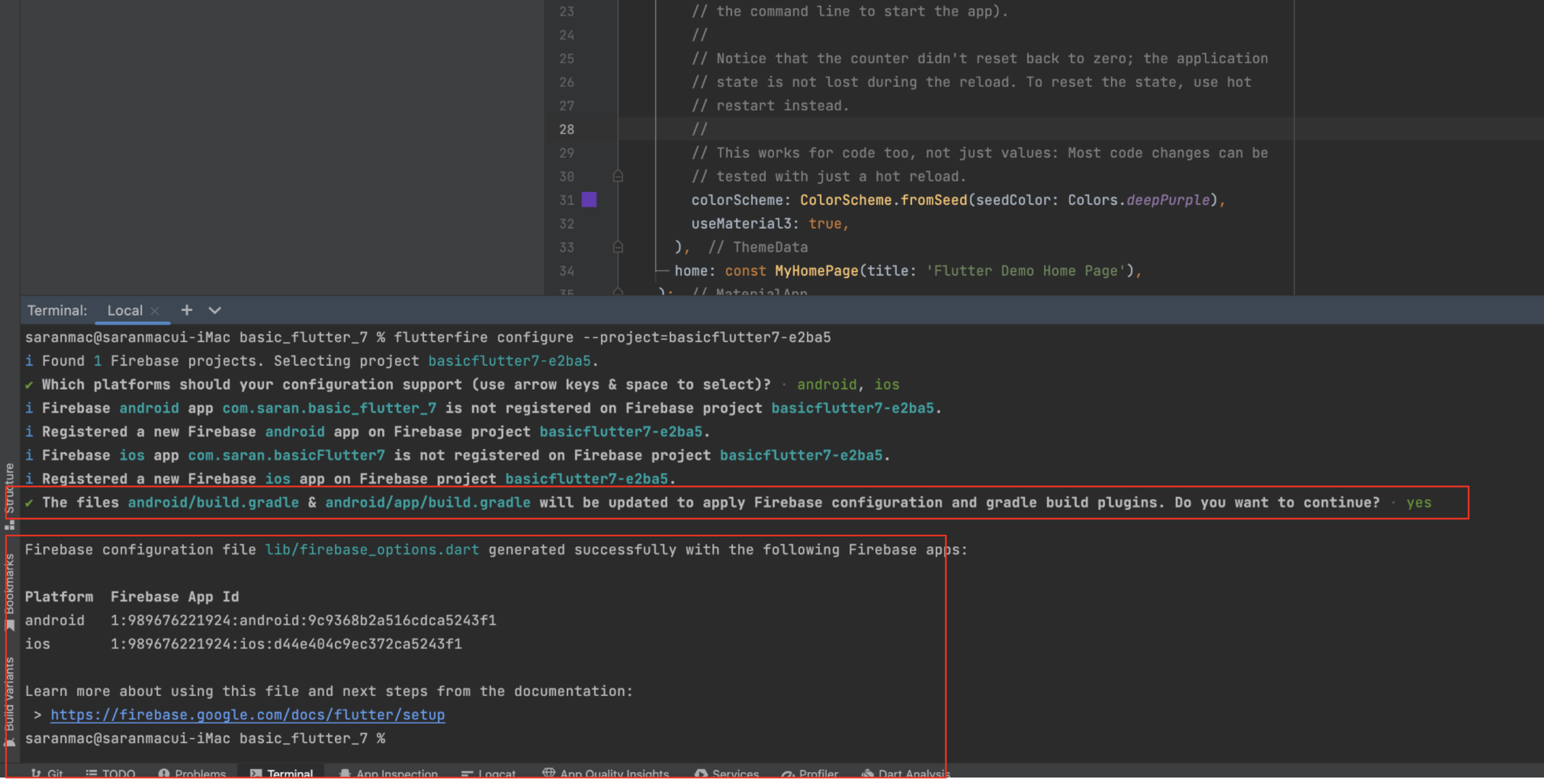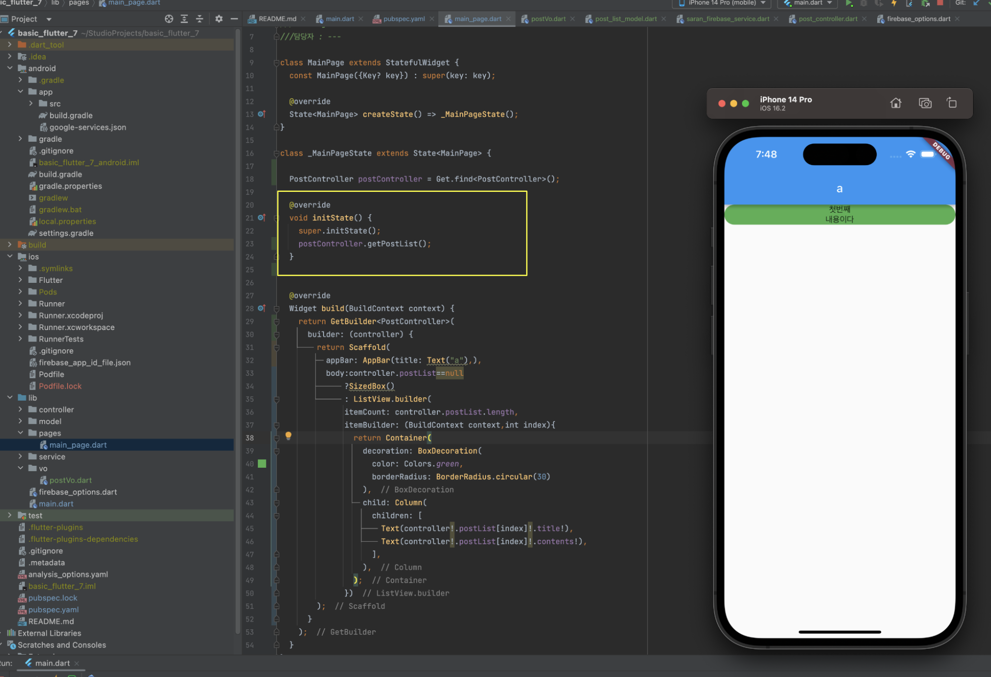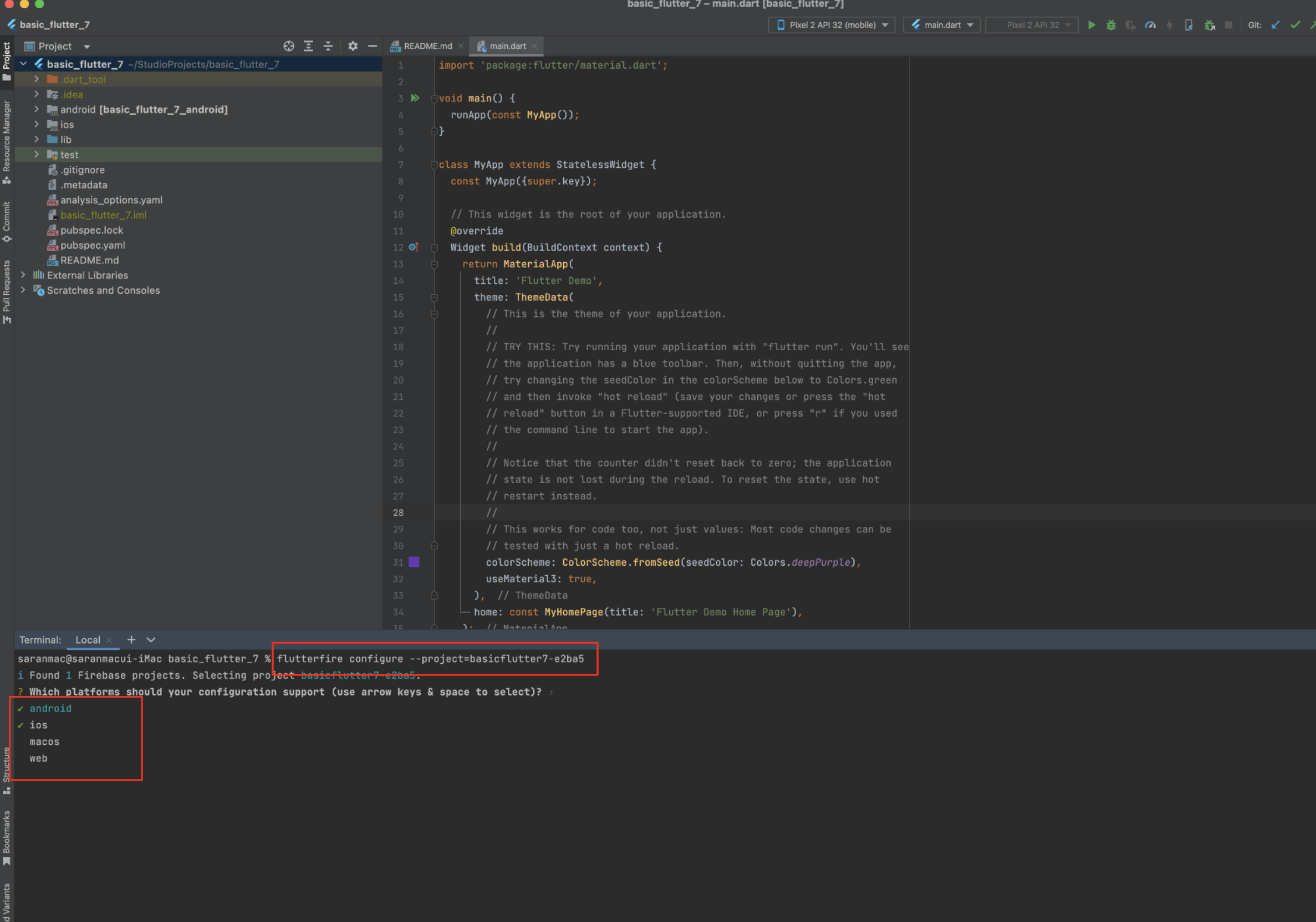 (명령어칠때 경로가 맞는지 확인하세요. 근데 자동으로 설정되어있을거에요. 저같은경우 명령어 칠때 앞에 경로가 basic_flutter_7이라고되어있죠)
