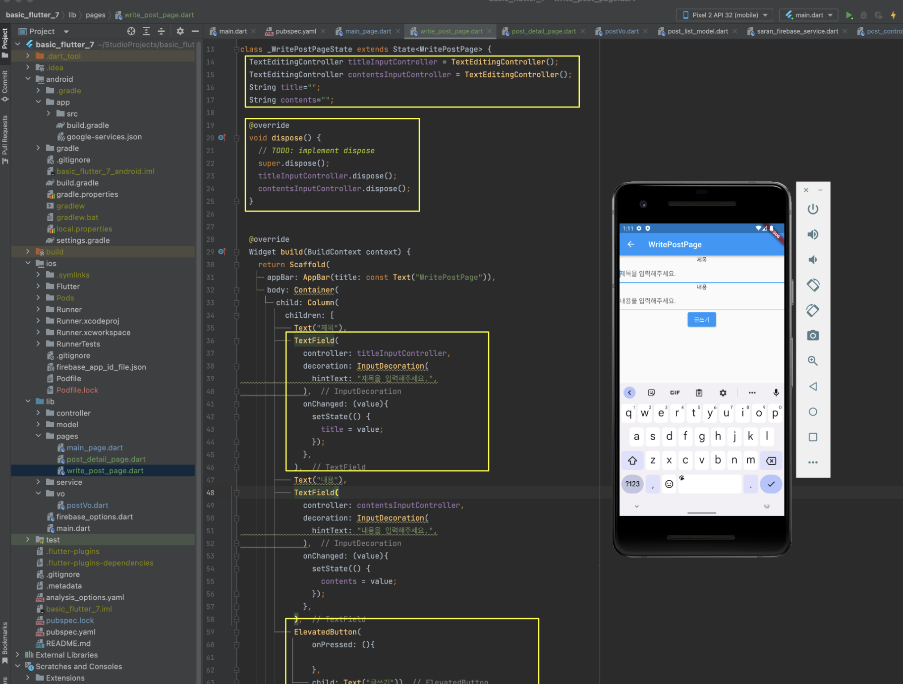 UI는 대충 만들어 봤는데요 TextField 라는 위젯을 이용해서 글을 입력할수있게 했습니다.