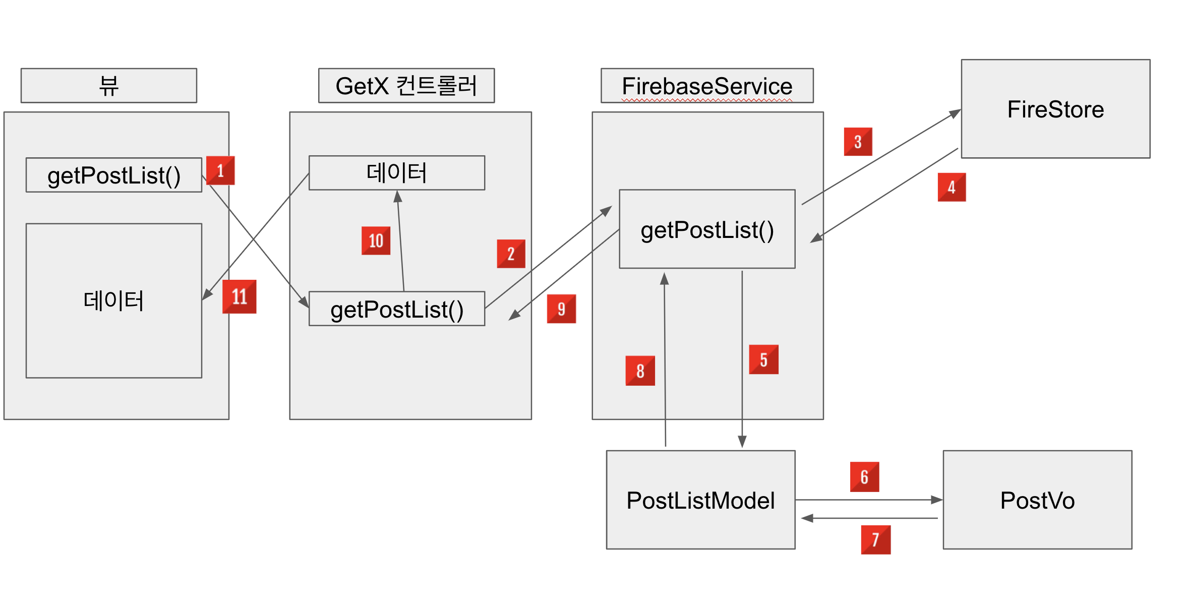 1. 뷰단에서 상태관리에 있는 getPostList를 호출 -> 상태관리 컨트롤러 안에있는 getPostList가 실행됨.