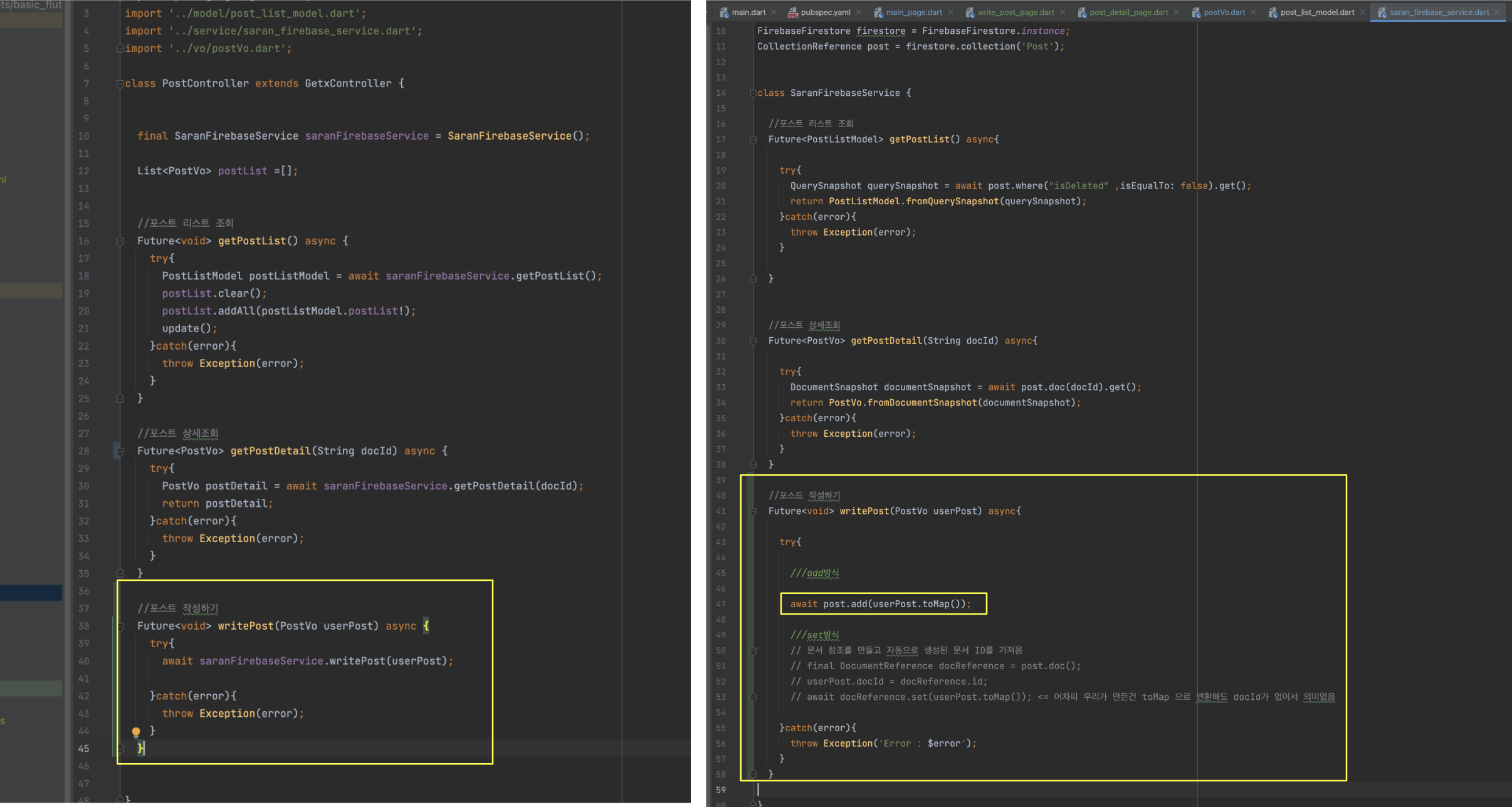 마찬가지로 saranFirebaseService에도 writePost메소드를 만들어 주었습니다.