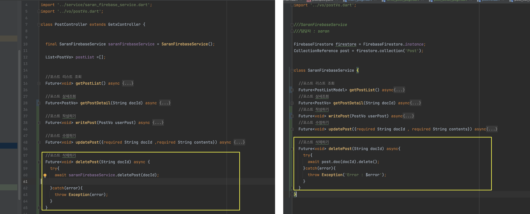 deletePost라는 매소드를 만들고 매개변수로 docId를 줬습니다.